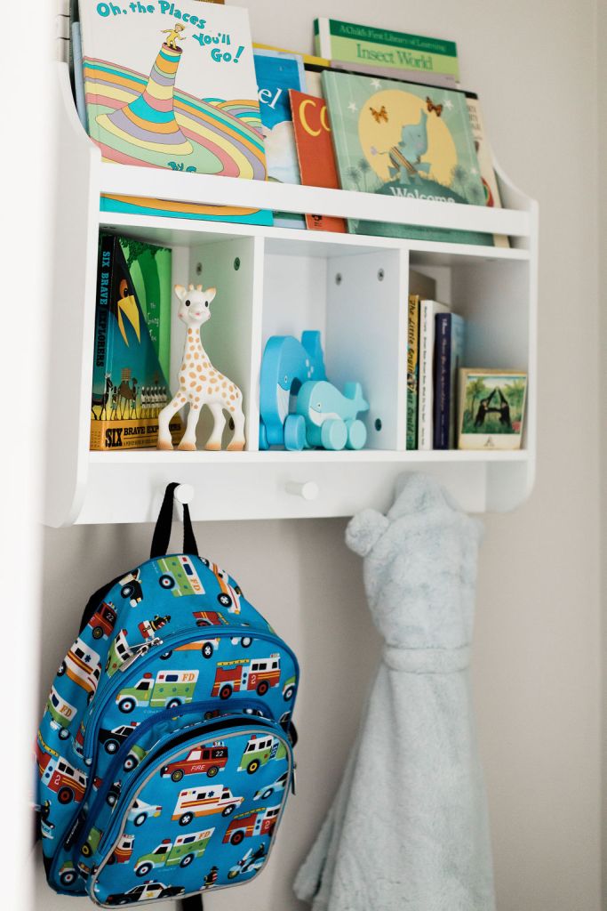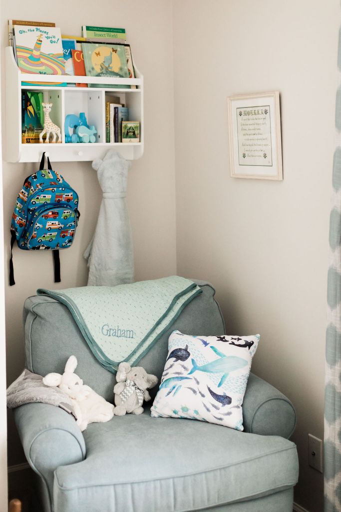 The stained glass lamp on his bookshelf is one that my mom made. It’s been at our beach house for years, but I decided it was the perfect little night light for his room and brought it home. The green in the lamp was starting point for the whole room. I had a bluish green vision, with a little bit of an ocean theme. I think it came together perfectly!