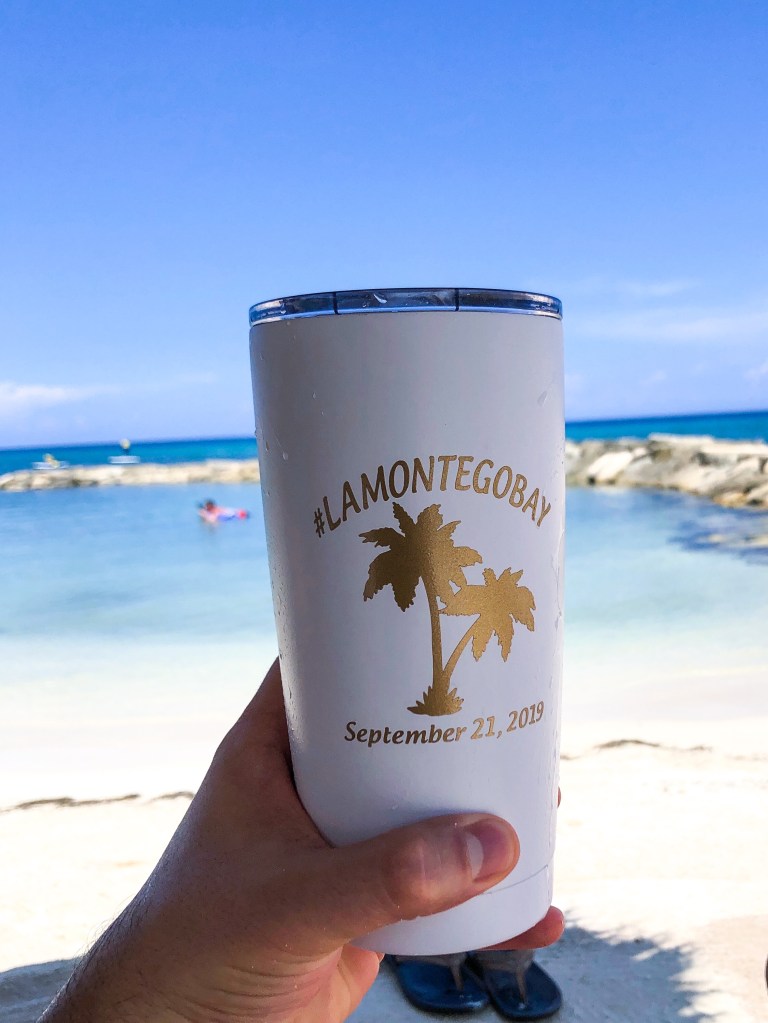 We chose to do custom tumblers as the biggest part of the gift, and then added in some necessities. The tumblers were a suggestion from a friend who had recently been to Mexico and noticed people at the bar filling up YETI tumblers with drinks. Turns out the bartenders at these resorts do not care what they put your drinks in, and the plastic cups they use are wasteful, plus they don’t keep your drinks cold! The tumblers were a huge hit. I would have loved for them to all be YETI, but I had to pay for them so we bought them in bulk on Amazon and they did the trick.