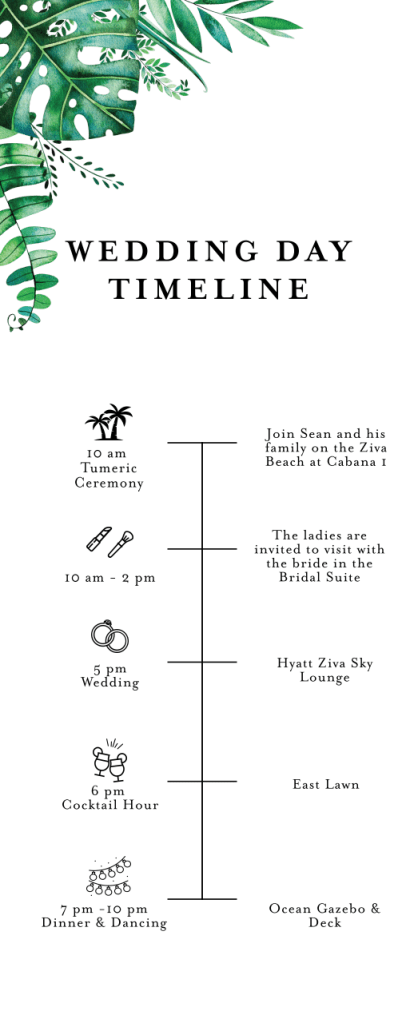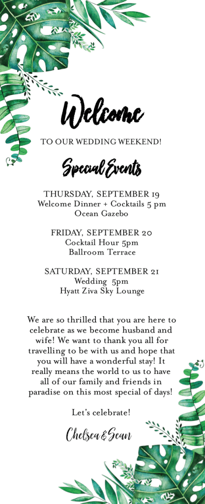 Typically at weddings I have been to the bride and groom left the welcome gifts at the hotel check-in desk. The Hyatt Zilara Rose Hall, where we got married did not allow for this. Instead they hand delivered each bag to the guests room. This was a nice touch that I think the guests appreciated, but there is a charge for this service. I used these name tags on each bag tied on with gold ribbon, so they would know where to deliver them [this is something I had done ahead of time, I packed the bags with the name tags already tied on]. I ultimately felt like it was worth it though, so no one was wandering around looking for people trying to deliver the bags, and the guest had an itinerary on arrival which is so helpful for organizing things. I wish I had a picture of the finished product because they turned out pretty cute, but we were busy having fun.