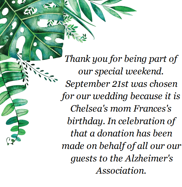 We included a weekend itinerary and thank you note to all of our guests in the bag. Buying these customizable templates was so great because we were able to use them for several different things at the wedding, including the itinerary, the welcome letter, the welcome signs, and the selfie station signs. In addition, we made a contribution in honor of all of our guests to the Alzheimer’s Association in honor of my mom and used the templates to include a special note.