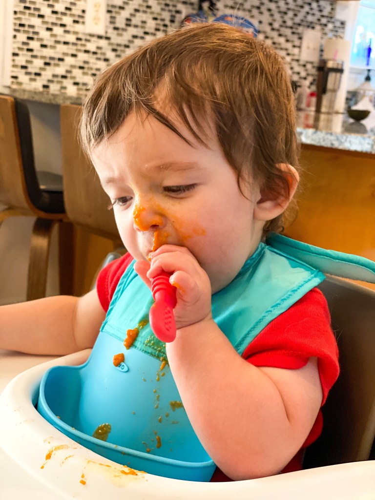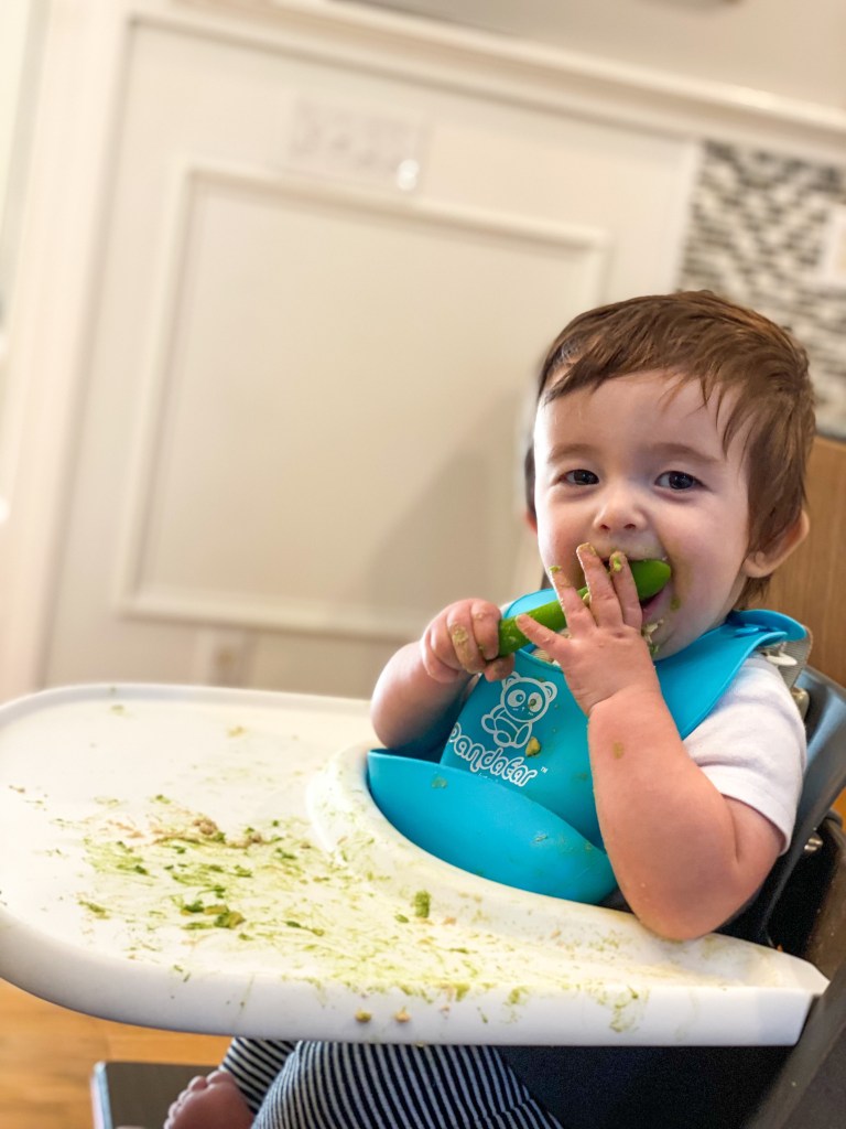 We are still working on eating food and sleeping through the night. Le sigh. You are showing little to no interest in food. You will play happily with the spoons covered in food and make the biggest mess, but when we try to feed you, you purse your lips together and turn your head in protest. I’m hoping this does not mean you are going to be a picky eater. And probably, because you aren’t taking in much solid food you still are not sleeping through the night. We’ve made major progress, you go down at 7 pm, sleep until we wake you for a bottle around 10 pm, and go back down until 4 am. After that you will typically go back down until 6 or 7, so I guess we can’t complain.