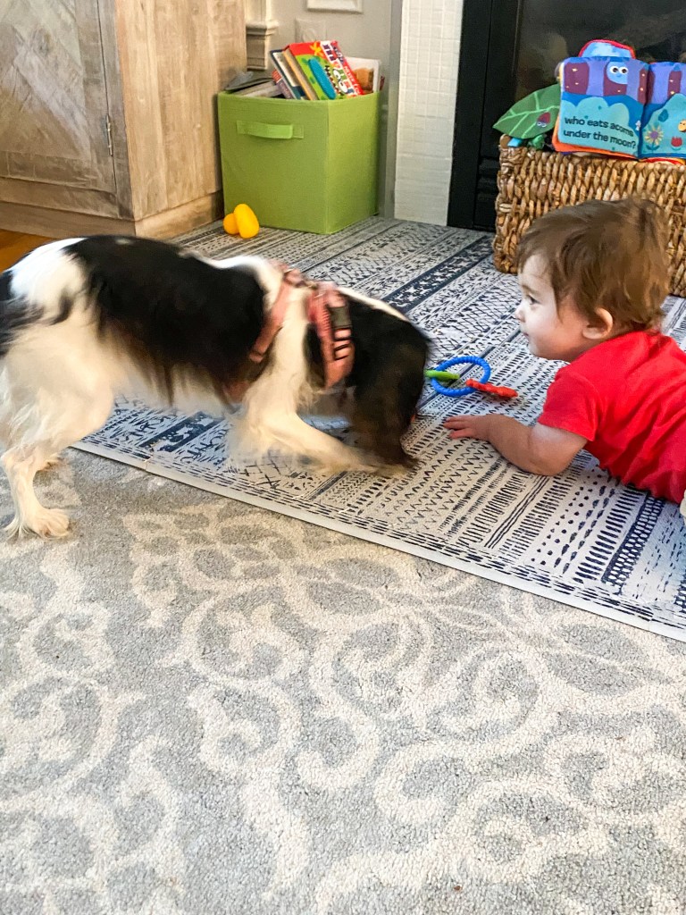 You found Bertie’s water bowl and want to play in it all the time. You have been working on pulling up trying to stand this month, at 35 weeks you were able to stand up in your crib, and you can sometimes do it by yourself on the furniture now. All you want to do is practice standing now, by holding hands with someone.